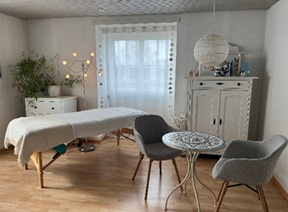 Der Raum ist grosszügig und ruhig, hat eine kleine Küche und ist eingerichtet. Zur Verfügung steht eine Massageliege und ein Futon.